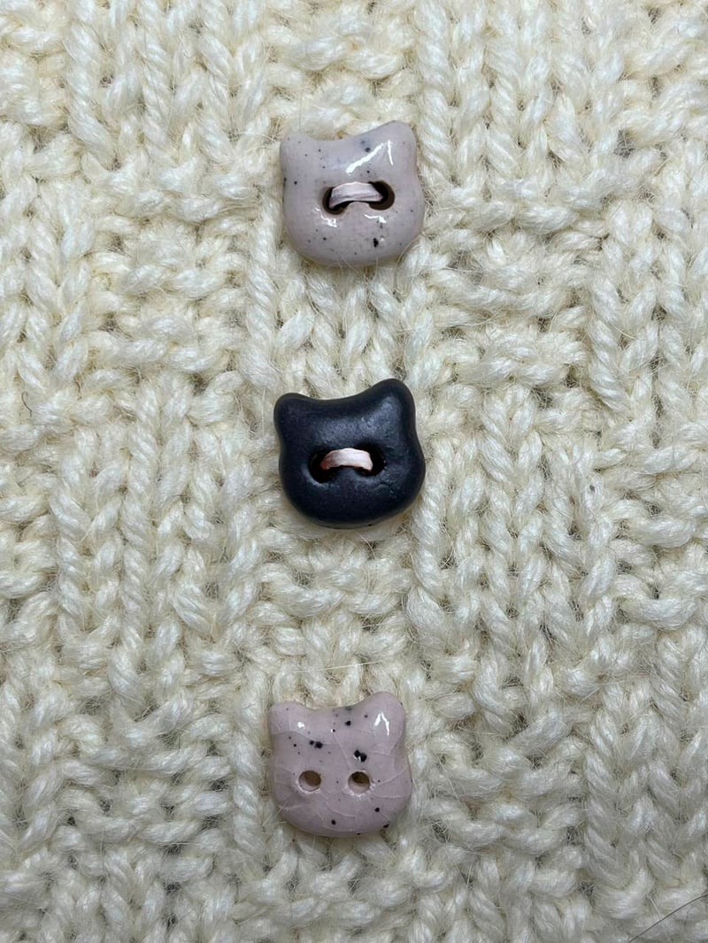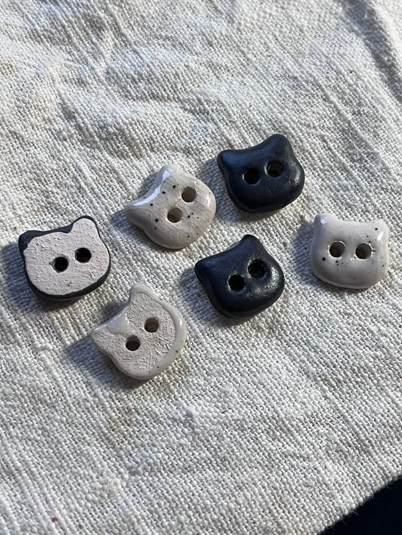Cute cat head handmade ceramic buttons for kids, knitting, sewing, crocheting, scrapbooking and crafting. Perfect for cat lovers. Speckled beige color.