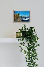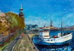Seascape miniature original oil painting on cardboard for home decoration. On the painting you can see a launch boat berthed at Stockholm's embankment and a woman in red strolling towards the Town Hall of Stockholm in nice sunny weather.